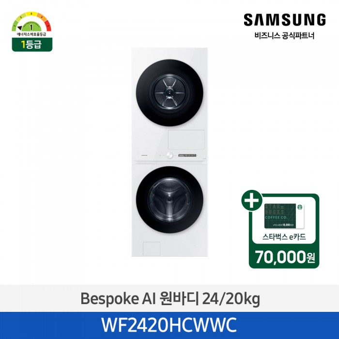 [삼성][24kg+20kg][화이트]BESPOKE 그랑데 AI 원바디 Top-Fit,에너지 소비 효율 1등급, 올인원 컨트롤[WF2420HCWWC] 4월 > 세탁기+건조기