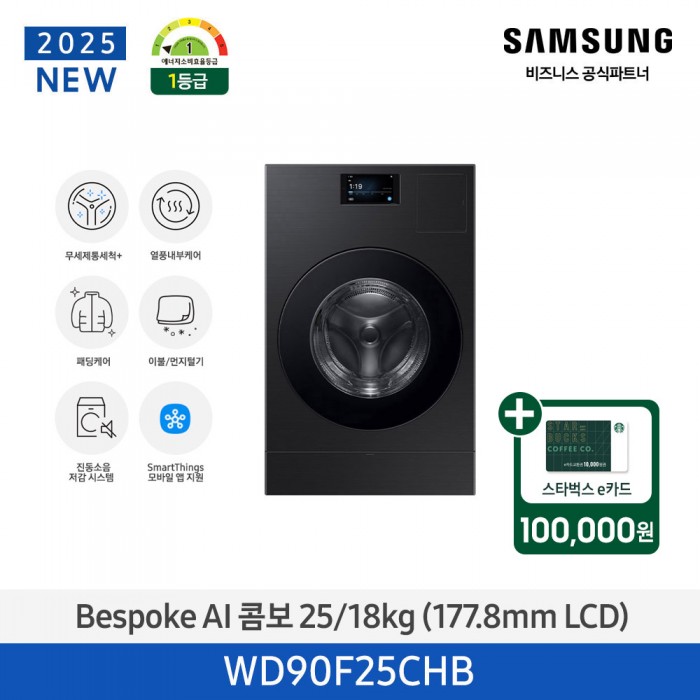 [삼성][터치 LCD 7인치][에너지 소비 효율 1등급]삼성 BESPOKE AI 콤보 (세탁 25 kg + 건조 18 kg) 블랙[WD90F25CHB] 4월 > 세탁기+건조기