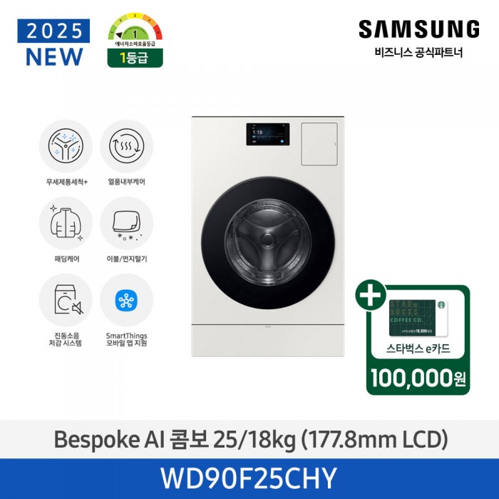 [삼성][터치 LCD 7인치][에너지 소비 효율 1등급]삼성 BESPOKE AI 콤보 (세탁 25 kg + 건조 18 kg) 그레이지[WD90F25CHY] 4월 > 세탁기+건조기