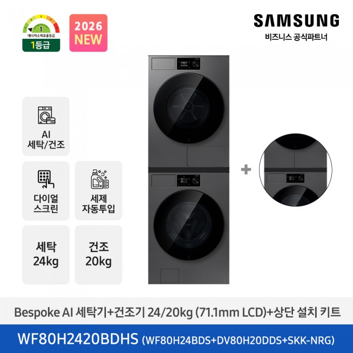 ★2026 NEW★[삼성] Bespoke AI 세탁기+건조기 24/20kg+상단 설치 키트 (다크스틸)(1등급) [WF80H2420BDHS] 4월 요약정보 및 구매